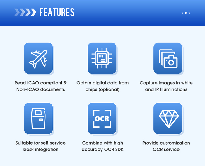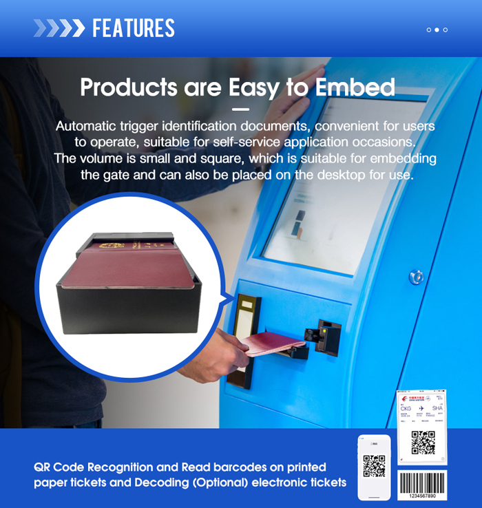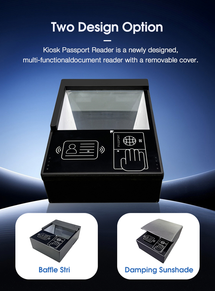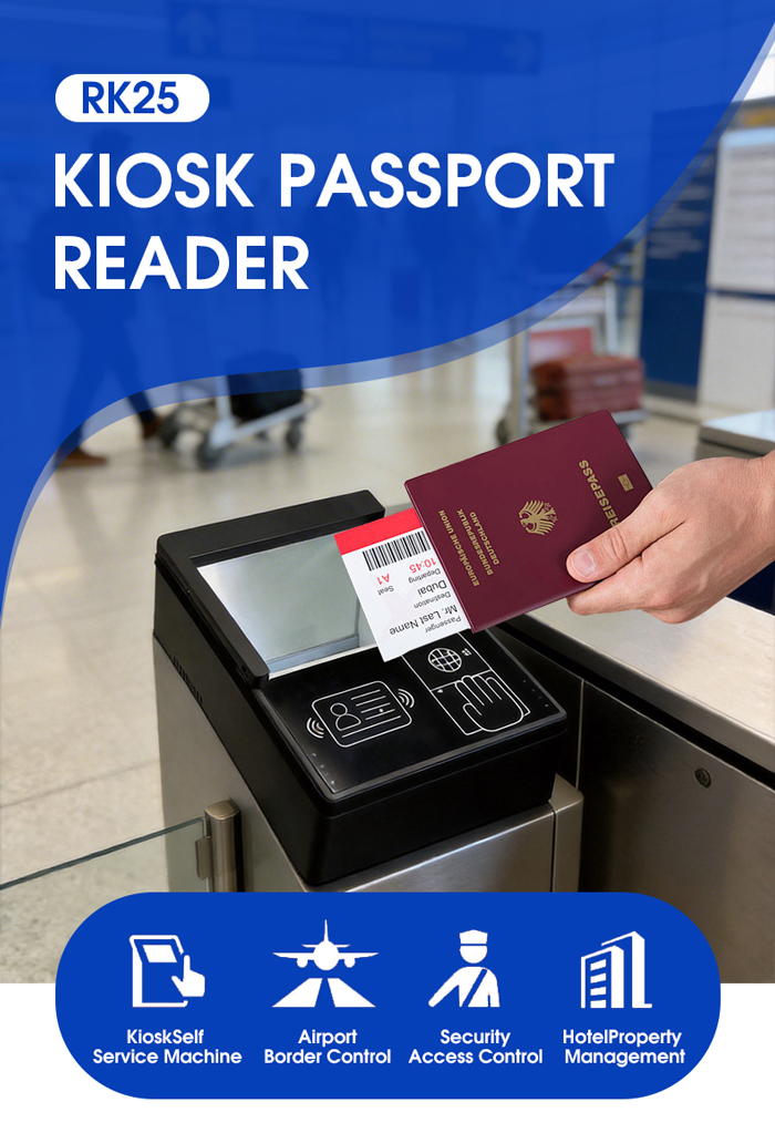 The RK25 Kiosk Passport Reader is a high-performance, ICAO 9303-compliant document scanner designed for seamless integration into self-service kiosks and border control systems. With support for MRZ (Machine Readable Zone) extraction, RFID (ISO 14443 Type A/B), and 2D barcode reading (PDF417, QR Code, Data Matrix), this all-in-one identity document reader ensures fast and accurate data capture. Ideal for e-passport authentication, visa processing, and ID verification, it features a 500 DPI CMOS sensor and supports both visible and IR illumination. Whether used in airport kiosks, hotel check-ins, or government agencies, the RK25 delivers reliable performance in compact form.