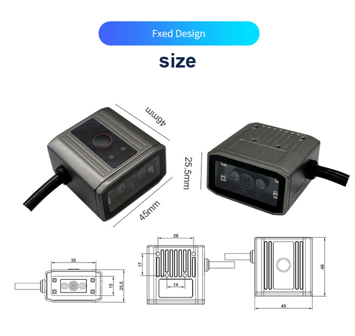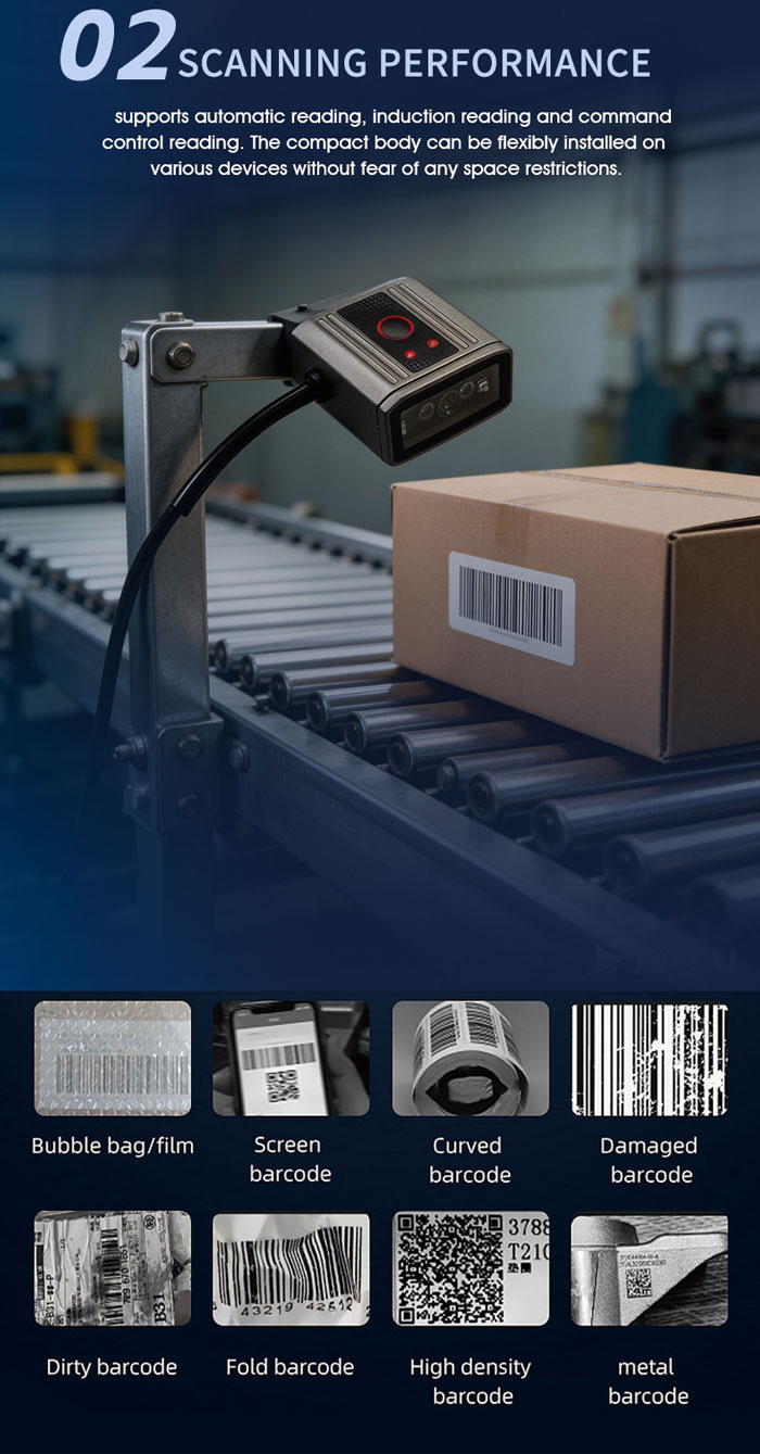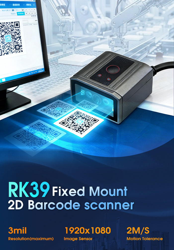 RK39 is a fixed 2D barcode scanner launched by Rakinda that is suitable for general industriaenvironments. Equipped with Al function processor, high-sensitivity lens, and combined withRakinda core decoding algorithm, it can easily identify DPl codes that are laser engraved, printor etched on various materials.lt has excellent decoding capabilities.RK39 supports automatic reading, induction reading and command control reading. The compactbody can be flexibly installed on various devices without fear of any space restrictions.