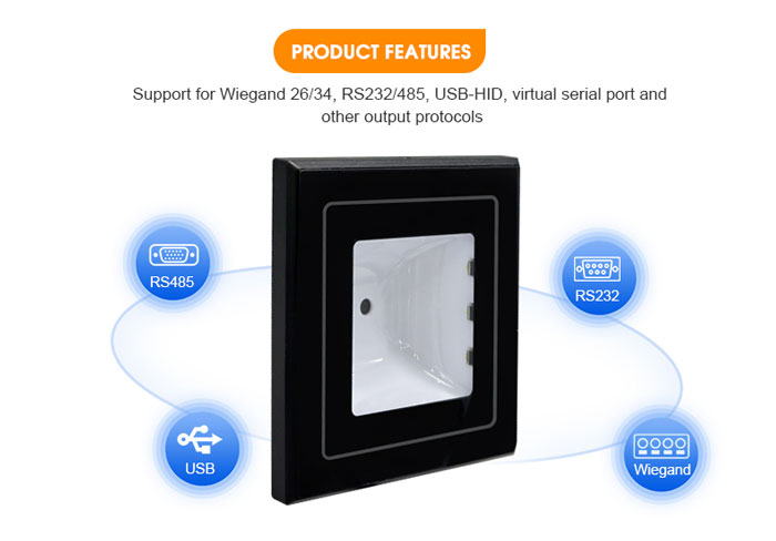 The RD005 is a robust, industrial-grade 1D/2D barcode scanner and NFC reader built for demanding environments. With its IP65 waterproof and dustproof rating, this scanner ensures a long service life and reliable performance in access control, public transportation, and outdoor kiosks. Its versatile 86-type panel design allows for easy embedding into various equipment, making it a perfect embedded barcode scanner for fixed installations.